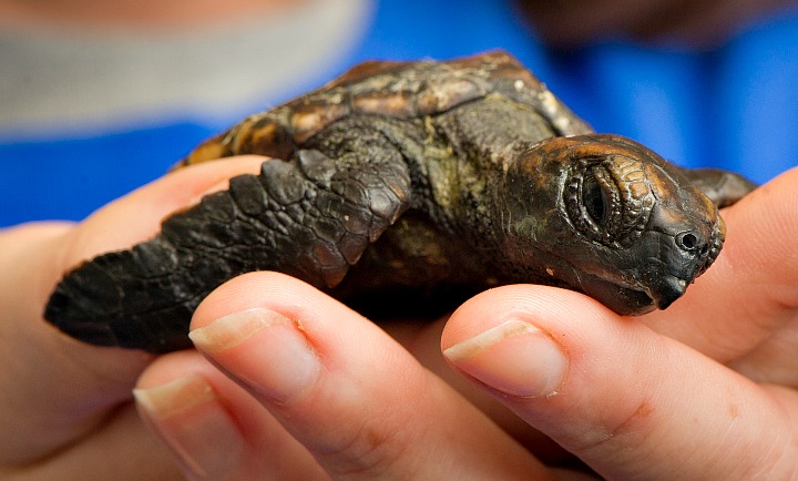 Because of their age and size, they’re living in a small brooder where the temperature is kept at a constant 84 degrees. They are in the water several times throughout the day but also spend time dry in order to conserve their energy. The turtles are taken home in their brooder each night by a turtle expert (aquarist) for middle-of-the-night feedings.
