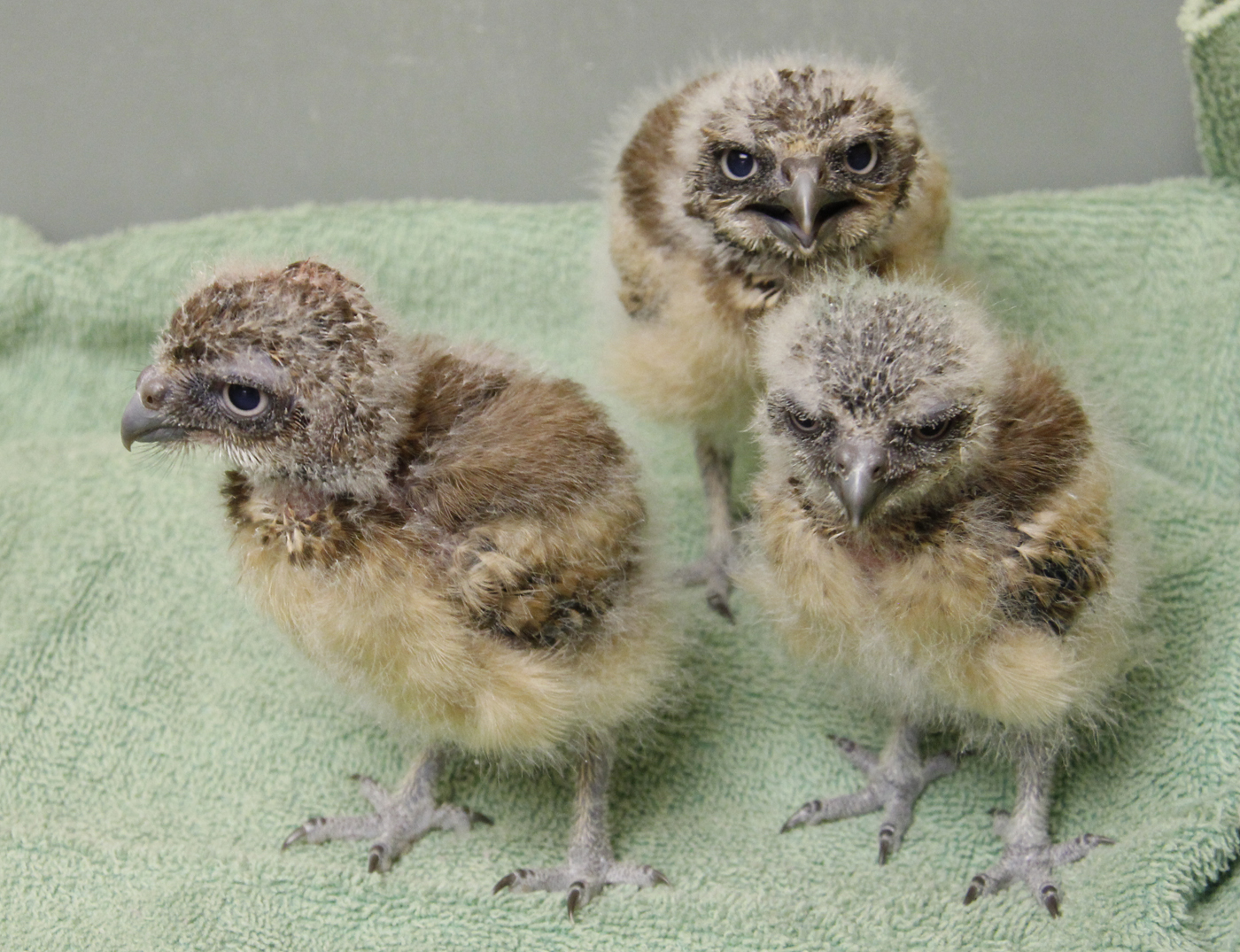 Three Burrowing Owlets recently hatched at the Sacramento Zoo. These fluffy little ones will grow to weigh anywhere between 4.5-9 ounces, and become 7.5 – 10 inches tall with a wingspan of 21 – 24 inches! Males of this species are slightly heavier and have a longer wingspan than the females, which is not the norm with most owls.