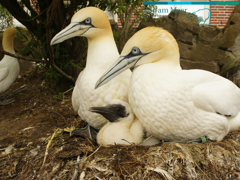 Three healthy Northern Gannet chicks hatched at Zoo am Meer Bremerhaven on the Northern coast of Germany,