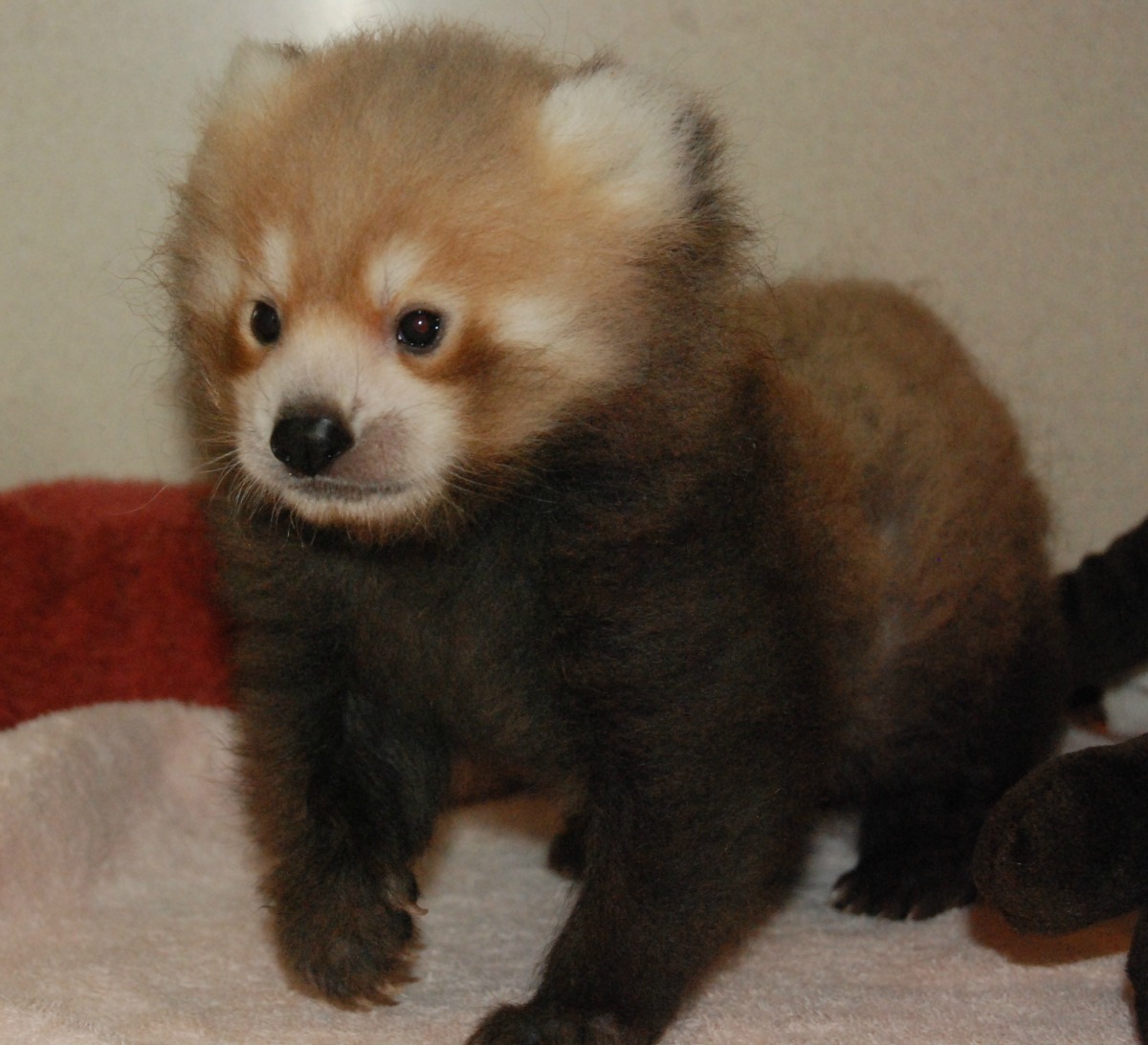 The cub, a male, was the first offspring for the zoo's Red Panda pair. When the cub was about two and a half weeks old, the zoo staff observed that the female may not have been providing enough milk for her cub, so they decided to hand-rear the cub, as described here on ZooBorns.