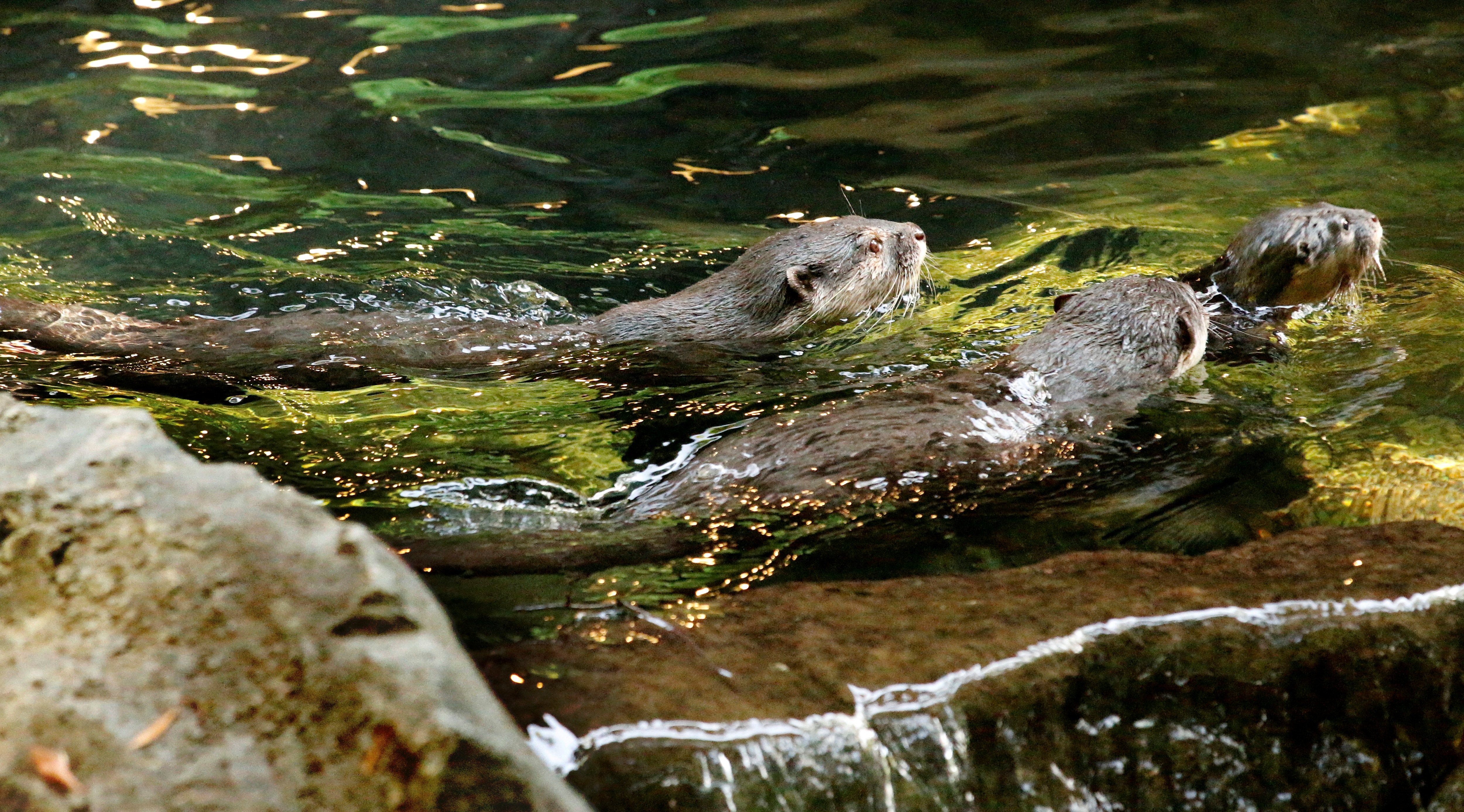 She now is a healthy 2.3 pounds (1 kg), and was introduced to the otters’ outdoor habitat last week. Because the pools and river in the Betty Moroney Norsworthy Otter Outpost are deep, Tasanee is being watched closely to ensure that she’s a strong swimmer and can navigate the sloping edges of the stream. She’s very curious and loves to explore, but her mother had to do a bit of encouraging to get her into the large pool. Guests to the zoo over the weekend were treated to the little otter’s tumbling, squeaking explorations.