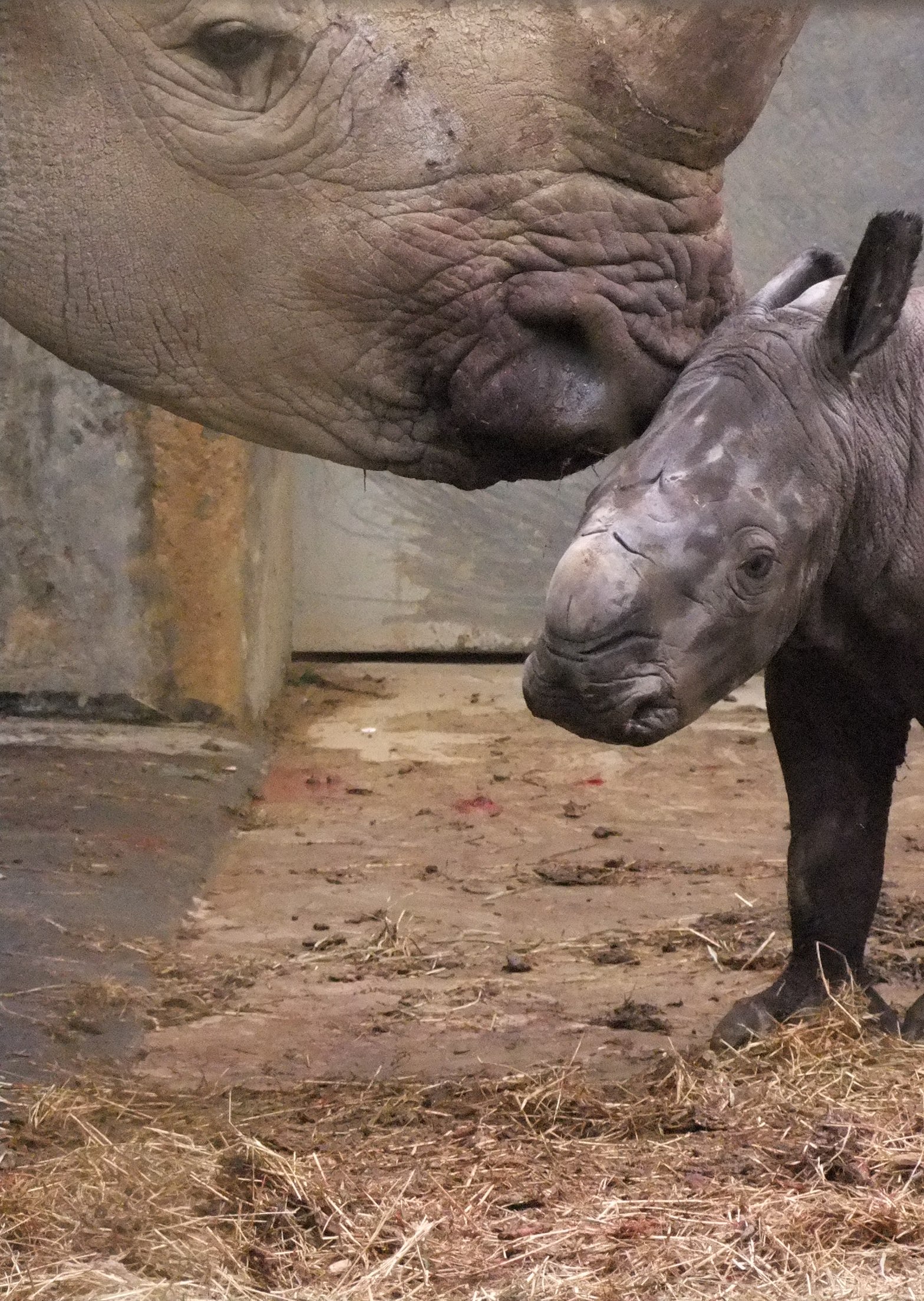 The Rhino calf’s father, ‘Monty’, and mother, ‘Ruby’, are both nine years old. In 2009, Ruby (along with another female called ‘Nancy’) made the eleven thousand kilometer journey from Mafunyane Game Farm, in South Africa, to the UK to join the young male, Monty, at their new Oxfordshire home. It was hoped that, one day, they would successfully produce the Park’s first ever Rhino calf. Monty has since fathered two calves. Nancy gave birth to a female, ‘Astrid’, in 2013, and now Ian has followed twenty months later.