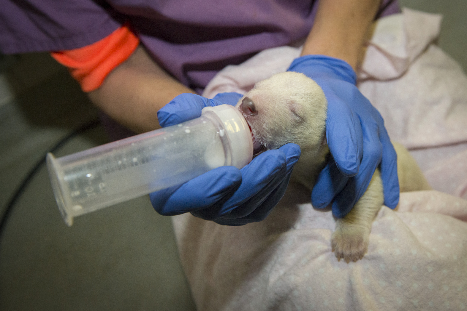 At this time, the cub, a female, is healthy and feeding regularly. She weighed in at 1.5 pounds and gained 10 grams soon after Zoo Staff took over. At 2-weeks-old, she is continuing to gain weight, and grows about a half inch every two days. Her nose is turning black and fur is growing on her ears, as well as on the bottom of her paws. Staff will continue to monitor and care for her around-the-clock. The team assesses her daily and makes changes to her routine as need be. They are cautiously optimistic and are pleased with how well she is doing.