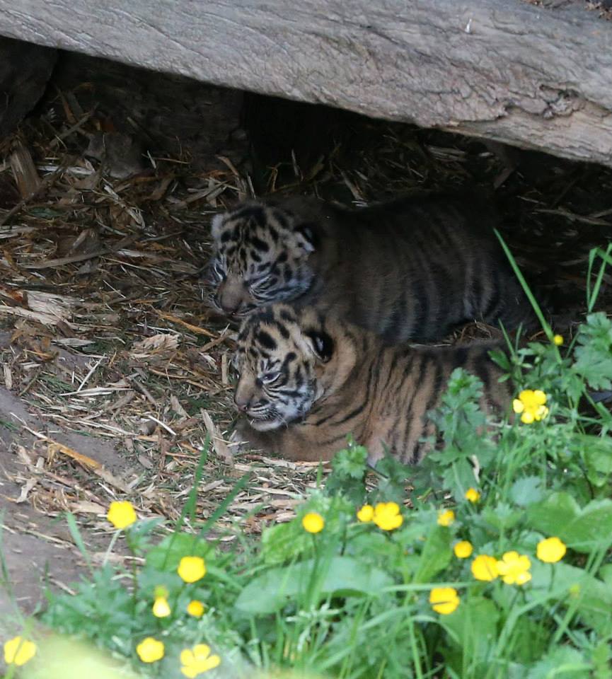 The baby, whose gender is not yet known, sports yellow and brown stripes which act as camouflage. The stripes will disappear at around 9-12 months.