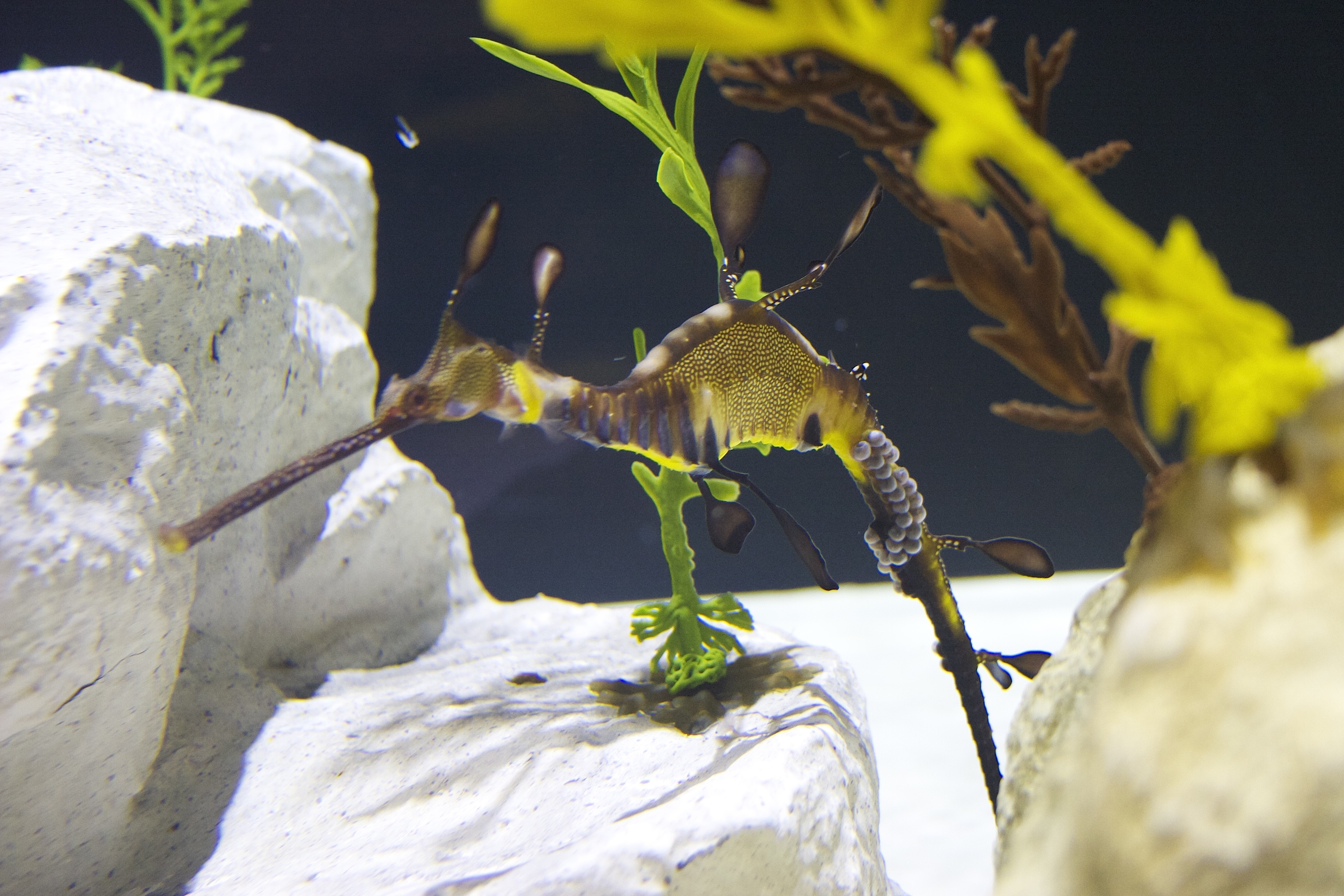 “Transporting adult Seadragons is not something that happens very often, and we were a bit concerned about how well they would handle the move from Monterey to Birch. When the male weedy was discovered with eggs on its tail, that elevated our worry to a new level, ” said Jonelle Verdugo, associate curator of fish and invertebrates at the Monterey Bay Aquarium.